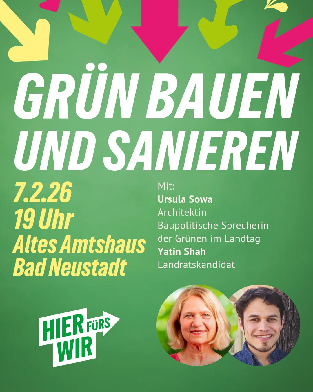 Samstag, 7. Februar um 19 Uhr: Wir laden herzlich ein zum Vortrag „Grün Bauen und Sanieren“ mit Ursula Sowa, Architektin und baupolitische Sprecherin der grünen Landtagsfraktion Bayern. Mit dabei ist auch Yatin Shah, Landratskandidat. Veranstaltungsort ist das Alte Amtshaus in Bad Neustadt.